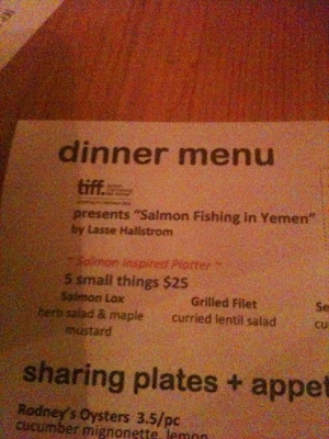 {On my birthday I was really forward to having one of my favorite restaurant‘s Parsley Pesto whitefish. When I got to the restaurant I discovered they had changed their whole menu for TIFF. The new temporary menu is based on a film called “Salmon Fishing in Yemen”}