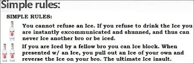 BROS ICING BROS.A bro icing occurs when one bro surprises another unsuspecting bro with a bottle of Smirnoff Ice (hey, remember that stuff?) and then forces said bro to chug it while on bended knee. The rules of bros icing bros are simple: