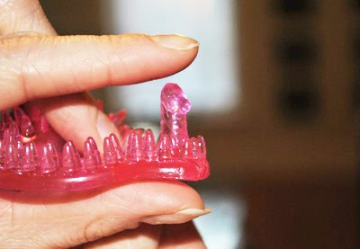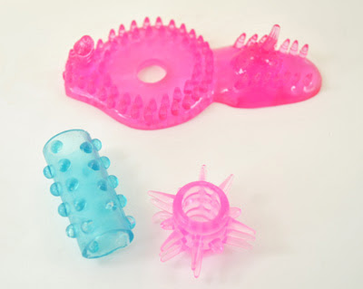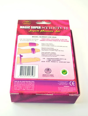 Exhibit B: I was the lucky winner of the “The Magic Super Stretch Superb Pleasure Set” (try saying THAT three times fast). This little dream team promises that “Each tickler delivers different sensations. Enjoy one at a time or in thrilling combinations!“. The box also states in bold letters, “USE WITH PENIS OR FINGER”. I don’t know about you but, I don’t really trust a sex toy that promises to fit both a penis and a finger, two appendages that one always hopes are two very different sizes.