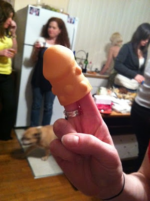 What’s that on my finger you ask? That’s a plastic penis extension! You know – for the guy who “wants a little bit more” (because nothing says romance like “hold on babe, let me go grab my fake penis tip to put on top of my real penis. Yeah, that’s the stuff!”). The contraption had a weird plastic-y feel. I imagine these are made in the same factory as clown noses. I also imagine there is a whole assembly of line of Chinese factory workers laughing at us, as in “I can’t believe the shit westerners buy“